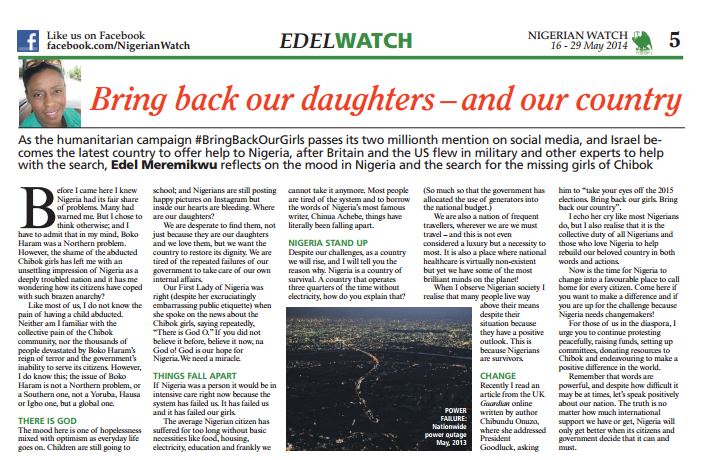 More than two years marks the anniversary of the abduction of almost 300 Chibok girls in Northern Nigeria. I was living in Nigeria reporting at the time, and their abduction happened three weeks after my arrival. I wrote this defiant piece above for Nigerian Watch newspaper EdelWatch column that I was penning at the time.